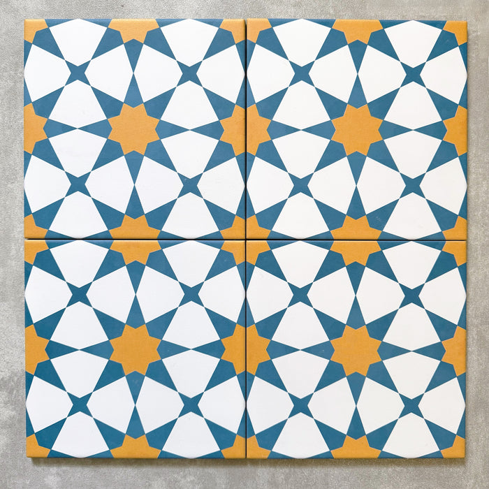 Perfect as a Moroccan floor tile or Moroccan wall tile, Agadir Sun and Sky adds warmth and energy to kitchens, bathrooms, patios, and feature walls. Its cheerful tones pair beautifully with white walls, warm woods, or natural stone—ideal for both modern interiors and traditional spaces seeking a splash of colour and charm.