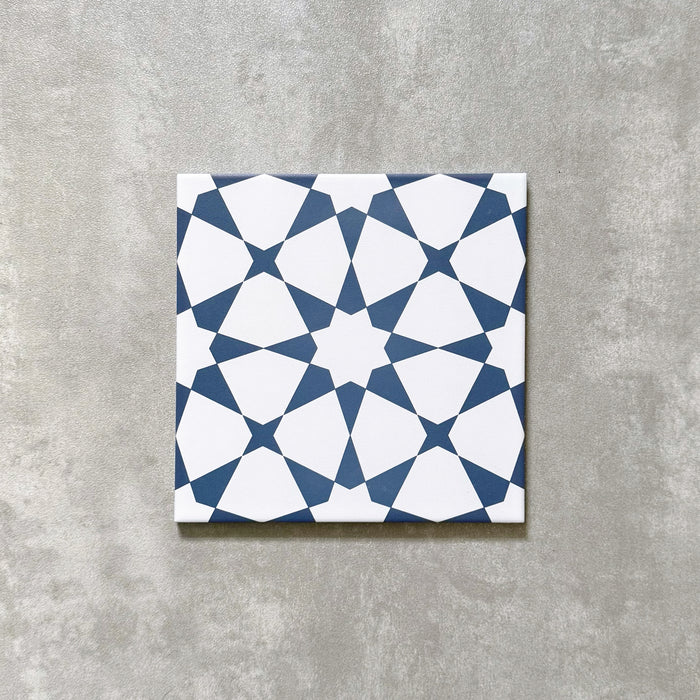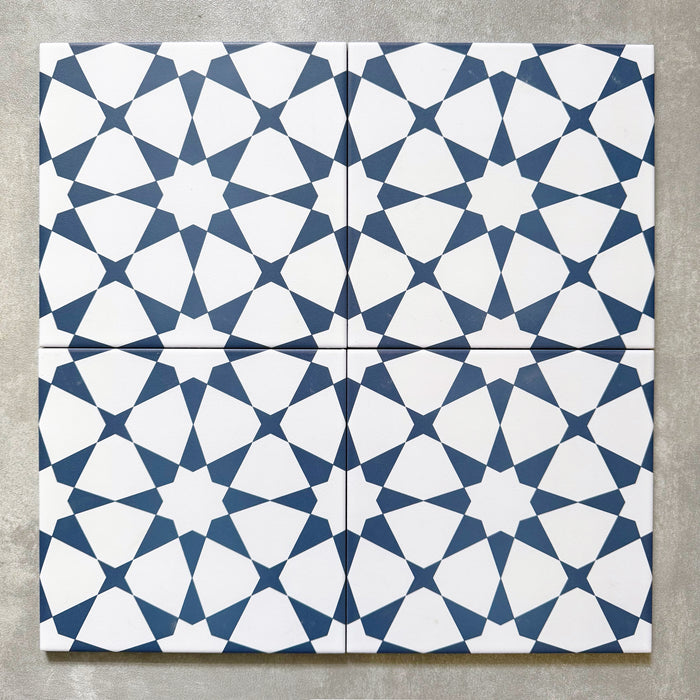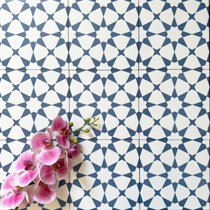 Agadir Navy Blue delivers bold Moroccan character with a crisp, timeless palette. This 20×20cm porcelain tile features a striking white and navy blue design inspired by Moorish patterns, offering a high-contrast look that feels both classic and contemporary. Its intricate detailing and deep tones create a focal point in any setting.