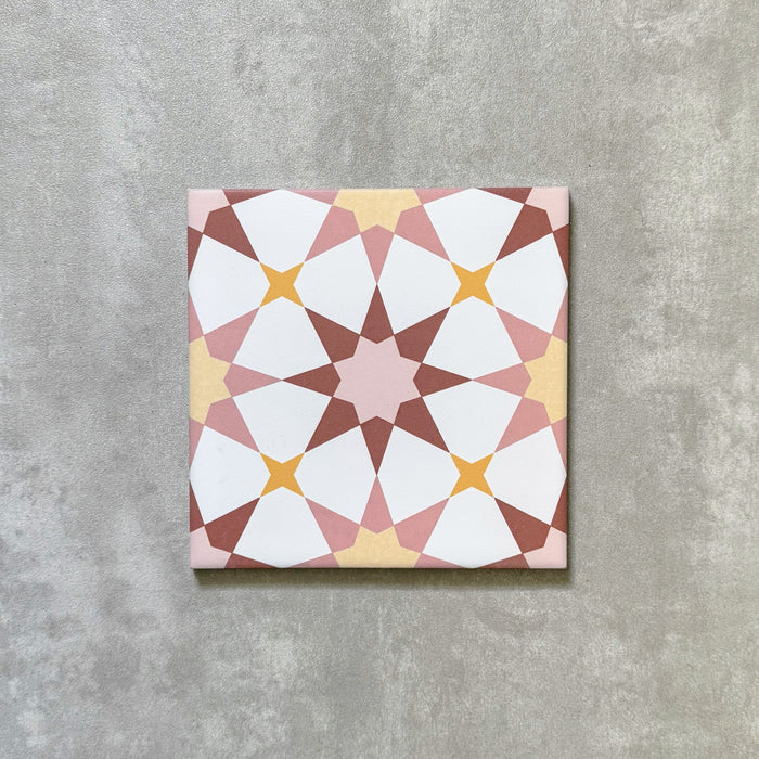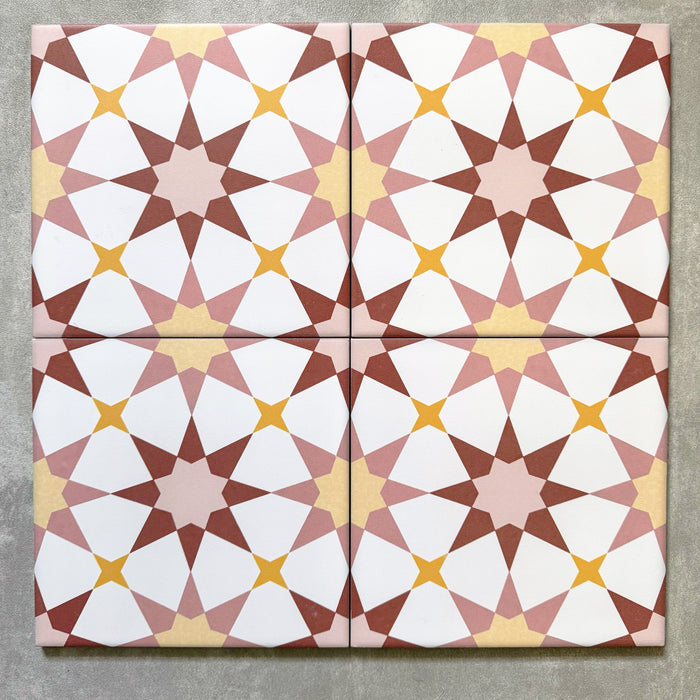 Agadir Springs blends traditional Moroccan charm with a playful palette of white, soft pinks, warm reds, and subtle yellows. This 20×20cm porcelain tile features a beautifully detailed pattern that evokes the spirit of Moorish design while bringing a fresh, uplifting feel to any interior or exterior setting.