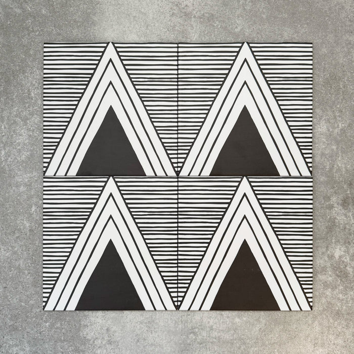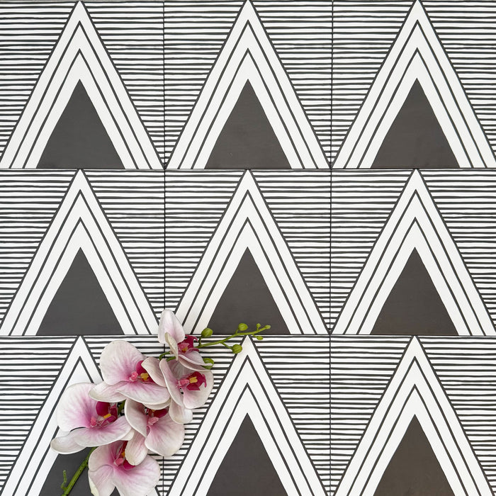 Almeira Giza is a bold statement tile that brings Moroccan-inspired design into a striking geometric form. Its black and white palette is elevated by a dynamic triangular motif, creating eye-catching rhythm and symmetry when laid in multiples. With clean lines and graphic impact, Giza offers a contemporary take on traditional pattern—perfect for interiors that lean into contrast and character.