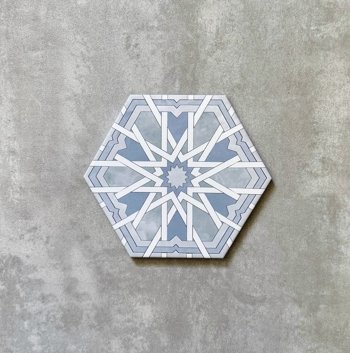 Hormuz Azure Blue brings striking Moroccan design to life with its starburst pattern and cool blue tones. Set on a classic hexagon shape, this tile combines intricate Moorish-inspired detailing with a modern palette of soft blue and crisp white. The result is a bold yet balanced design that adds instant personality to any interior.