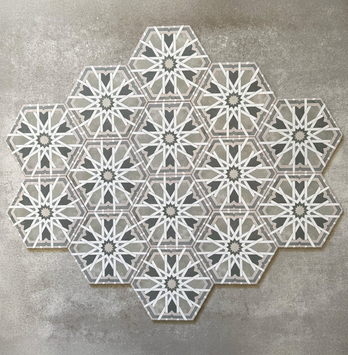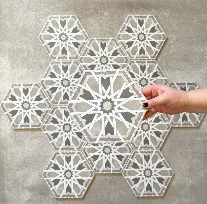 Hormuz Sage Green/Grey brings a grounded, natural feel to Moroccan pattern tiles with its soft sage green, grey, and white starburst design. The hexagon format adds a contemporary edge, while the intricate detailing nods to timeless Moorish artistry. The result is a tile that feels both calm and character-rich.