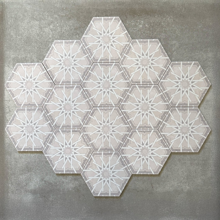 Hormuz Snow White offers a fresh, refined take on Moroccan pattern tiles, featuring a soft grey star motif on a crisp white background. The hexagonal shape gives it a clean, contemporary look, while the intricate design draws on classic Moorish influences. It’s a versatile tile that brings light and elegance into any room.