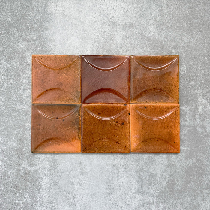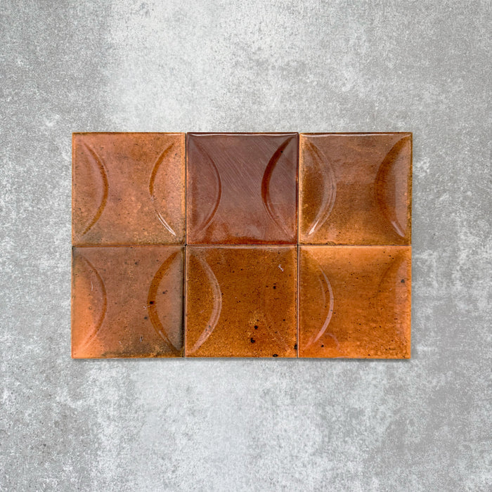 Saigon Amber Decor Square brings a bold decorative twist to traditional Moroccan wall tiles. With its 10×10cm size and rich amber glaze, this tile features subtle embossed detailing that adds a tactile layer to your design. The glossy, high-shine finish highlights natural colour variation across the surface—ranging from deep burnt orange to honeyed copper tones—making each piece feel full of life and movement.