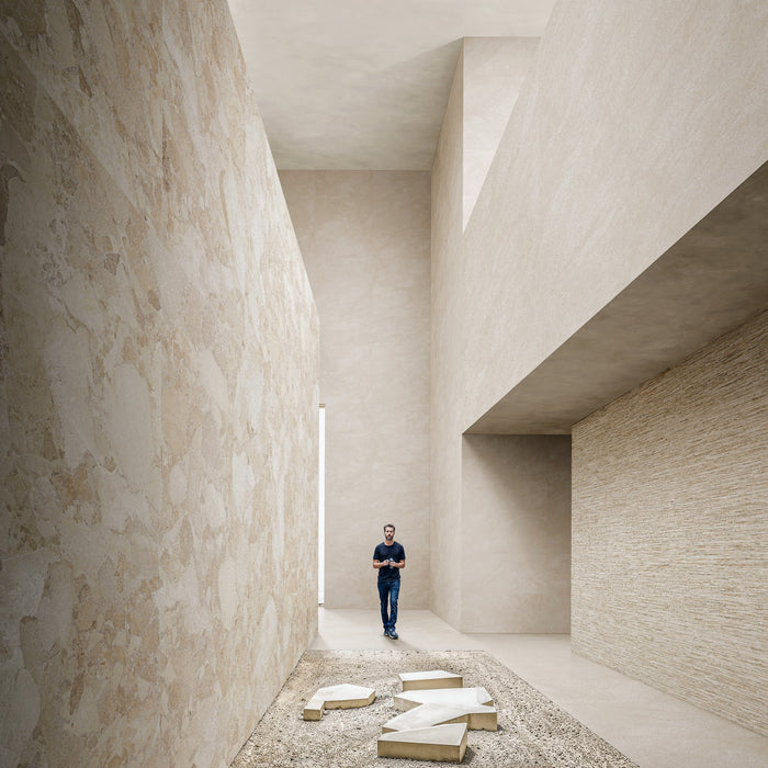 This collection features two distinct interpretations: Sassi, with its dynamic terrazzo-like pebble composition creating visual depth, and Neutra, offering a subtle texture with delicate veining. These complementary surfaces can be used independently or paired together, creating sophisticated interiors where tactile dynamism meets understated elegance.
