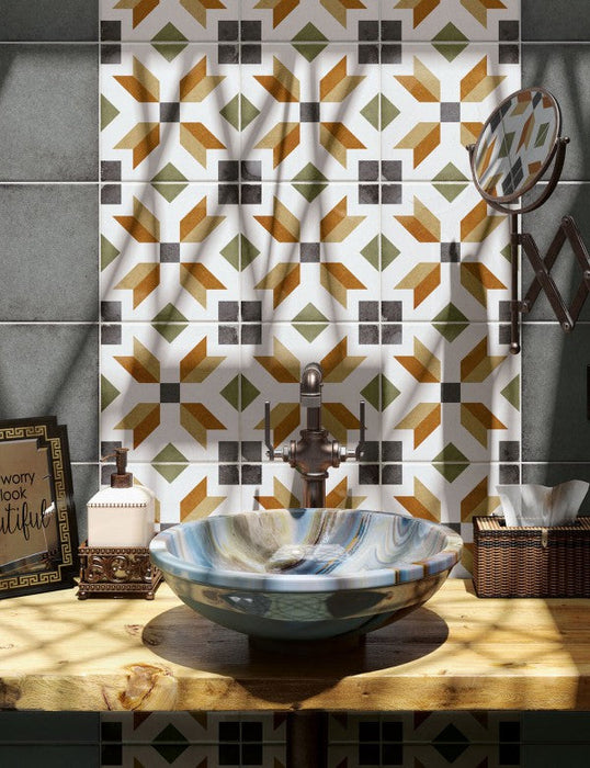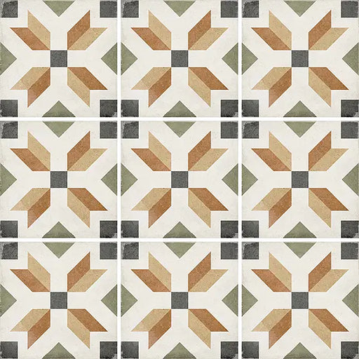 Viscount High Street brings a warm, earthy interpretation of Victorian design with its geometric star motif and subtle blend of orange, tan, and charcoal accents. The soft matt finish and lightly rustic detailing echo the charm of traditional encaustic tiles, giving this design the handcrafted look that defines the Viscount Collection. Its warm palette makes it an inviting choice for both classic interiors and modern spaces seeking heritage character.